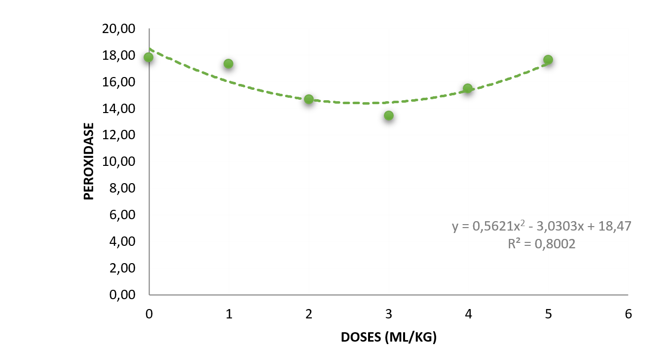 - Peroxidases: A atividade das peroxidases apresentou um comportamento quadrático, com redução em doses intermediárias e aumento nas doses mais elevadas, indicando um ajuste fisiológico da planta ao estímulo. O comportamento quadrático da atividade de peroxidases no trabalho (redução inicial e posterior aumento) reflete o que Passardi et al. (2005) descrevem como a regulação do ambiente oxidativo. Inicialmente, ocorre um “burst oxidativo” (rápida produção de oxigênio reativo) para sinalizar o perigo. As peroxidases entram em cena para regular esses níveis e, conforme defendido por Almagro et al. (2009), utilizam o peróxido de hidrogênio para “cimentar” a parede celular através da lignificação, dificultando fisicamente a entrada de patógenos.