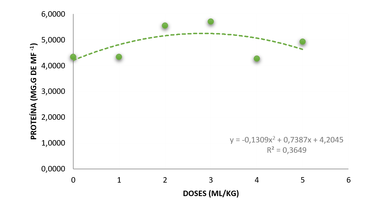 Figura 3. Teor de proteína em cotilédones de soja induzida pelo Sfinge® em diferentes concentrações (1 a 5ml/kg de semente).